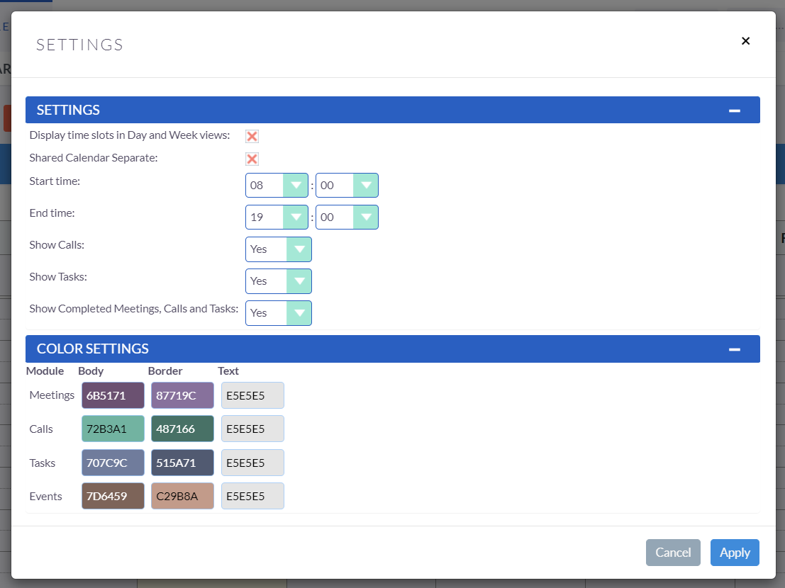 By clicking on the Settings button, you can open the calendar setting pop-up window, which enables you to modify the displayed hours of the calendar in quarter-hour increments, specify the types of events to be displayed, and customize the colors of the boxes, borders, and text for the different calendar items.