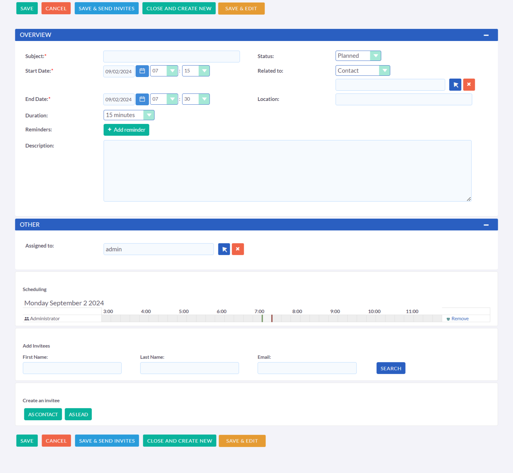 In addition, you can create an activity directly on the Calendar by clicking a single block or selecting multiple blocks corresponding to the duration of the activity. Afterward, the Create Activity pop-up opens.