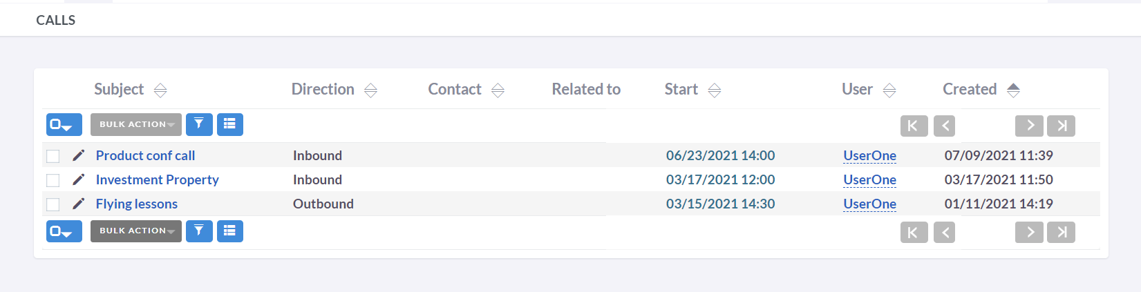 - To access the details of a call, click on its subject in the List View. This will open the call record in Detail View.