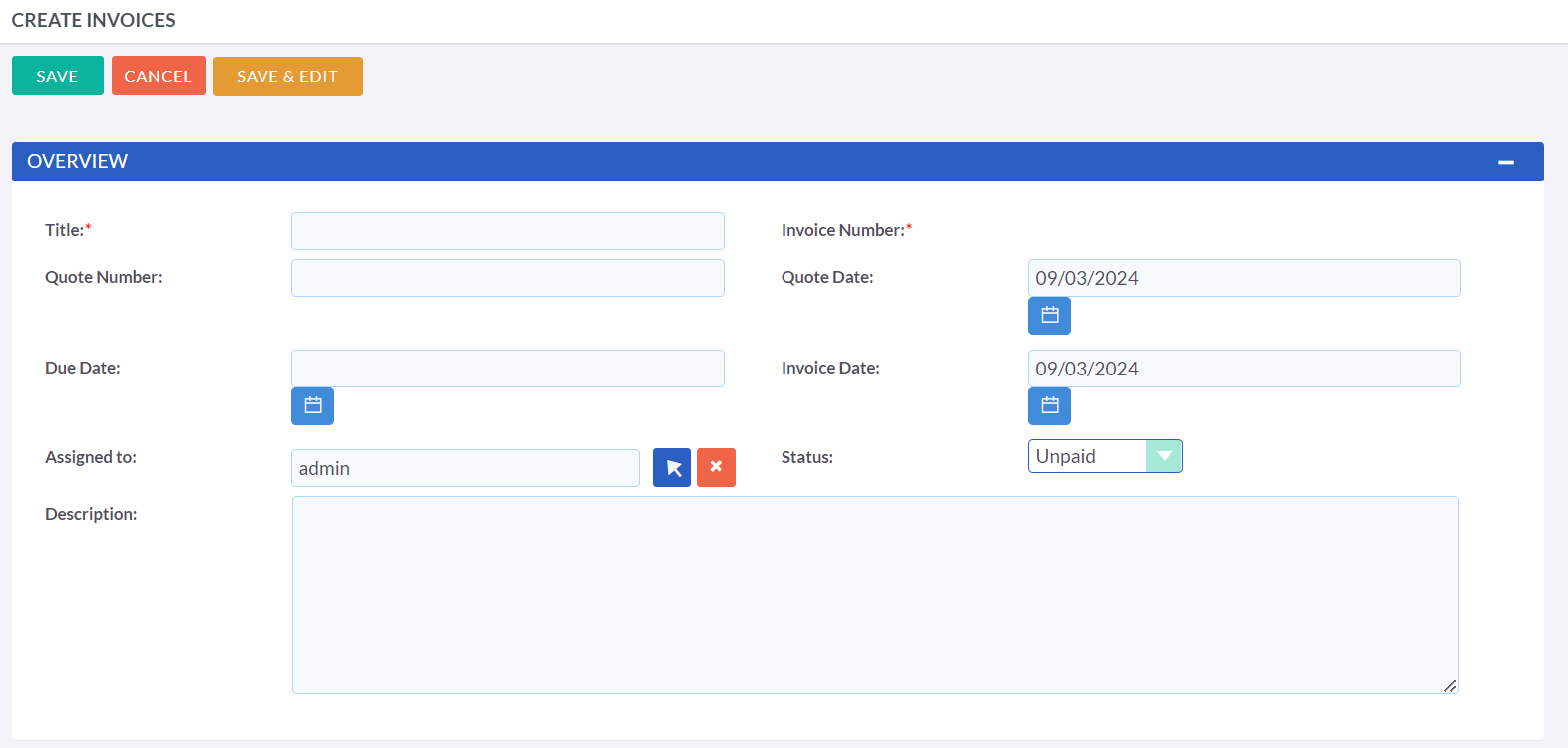 The process of creating an Invoice record closely resembles that of creating a Quote record. To initiate the creation of an Invoice, you can either select 'Create Invoice' from the actions bar within the Invoices module, or click the 'Add' button located at the bottom. The first panel of the creation process allows you to specify crucial details about the Invoice, such as the Status and Due Date.