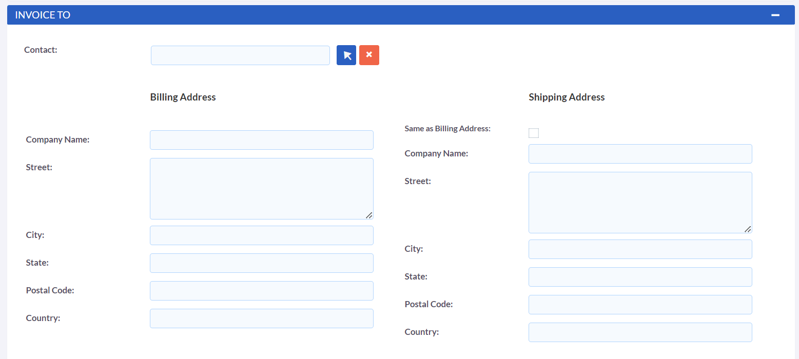 The second panel focuses on the recipient of the Invoice from the Contacts module. Upon selecting the appropriate Contact, the Billing Address is automatically retrieved and populated into the relevant fields of the Invoice record. In the event that the Shipping Address matches the Billing Address, clicking the "Same As Billing Address" button will efficiently duplicate the information into the relevant Shipping Address fields.