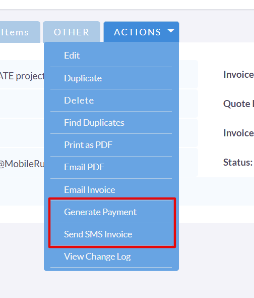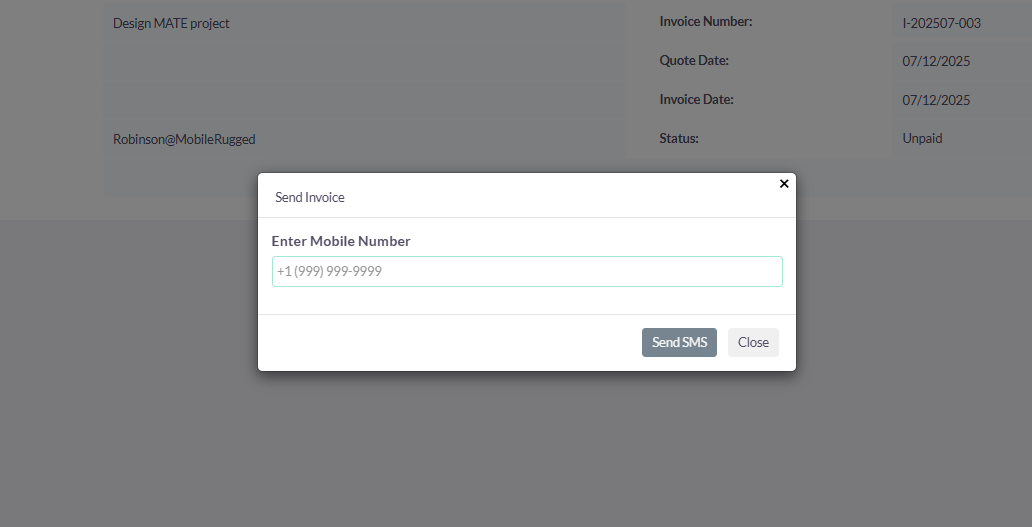 Send SMS Invoice: You can choose the SMS template, and a pop-up will open where you can enter a number to send the SMS invoice.