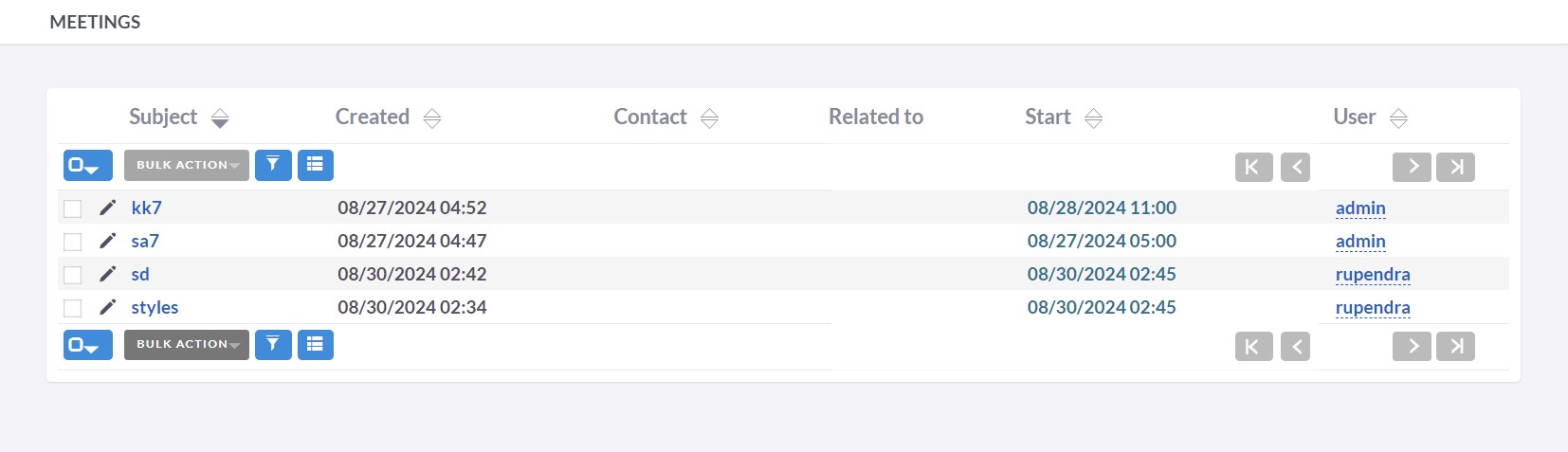 The Meetings module in BostelCRM, similar to the Calls module, enables Users to create Meeting records for any Meetings they have participated in. With the Meeting scheduler, Users can invite attendees, send email invitations, set reminders, reschedule meetings, and link them to other modules such as Contacts, Tasks, Opportunities, and more. This module offers additional useful features that aid Users in planning and managing their Meetings. Access the Meetings module by selecting it from the Module List menu on the top navigation menu or by using the Meetings button on the Bottom Navigation menu.