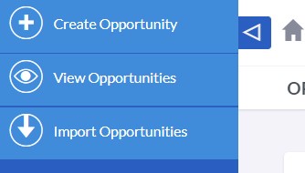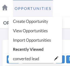 The following actions can be accessed for Opportunities from the Opportunities module menu drop-down, the Sidebar, or the Sales button at the bottom:
