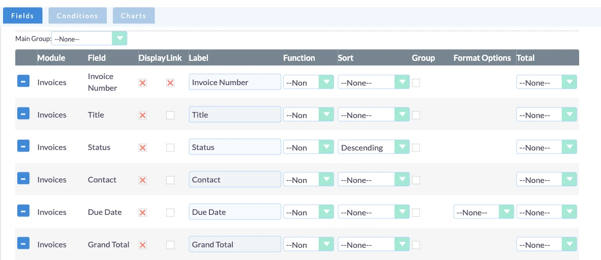 The Ascending or Descending option enables users to choose the sorting order for a field or column, either in ascending or descending order. This feature can be applied to all fields within the report.