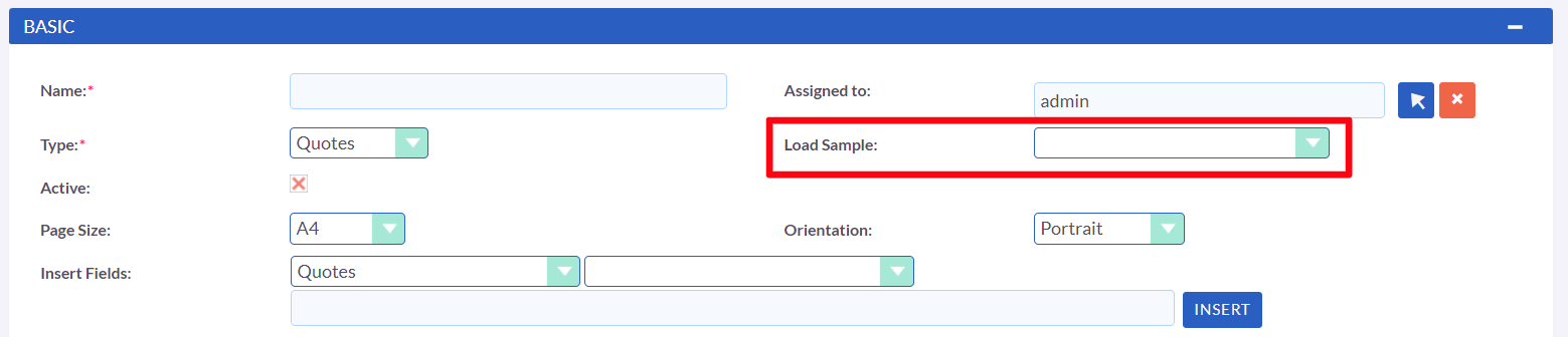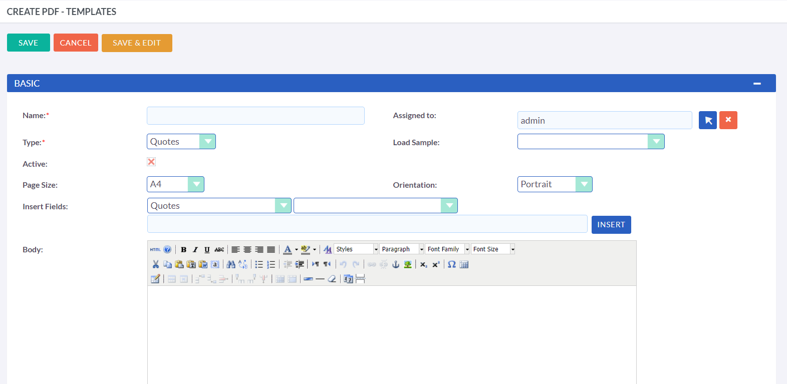 Selecting a module will populate the second dropdown with all the fields available in that module. After choosing the desired field, its variable name will appear in the text field. Click on "Insert" to add the field to the template's body. Enabling the "Active" checkbox will allow users to generate PDFs using this template while disabling it will prevent them from doing so.