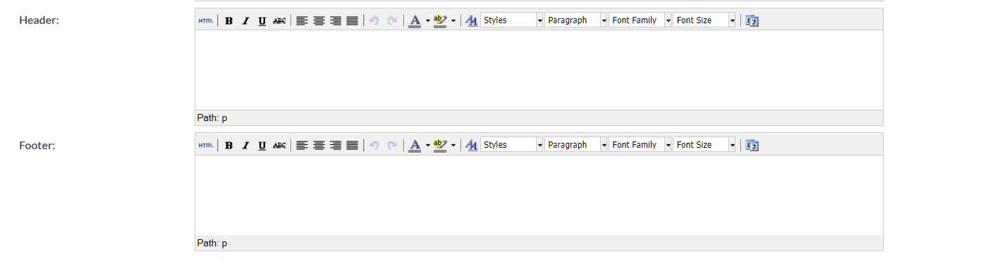 In the PDF Templates Edit View, you also have the ability to define a Header and a Footer for your templates. The Header and Footer can be created by utilizing the respective text areas located beneath the Body text area.