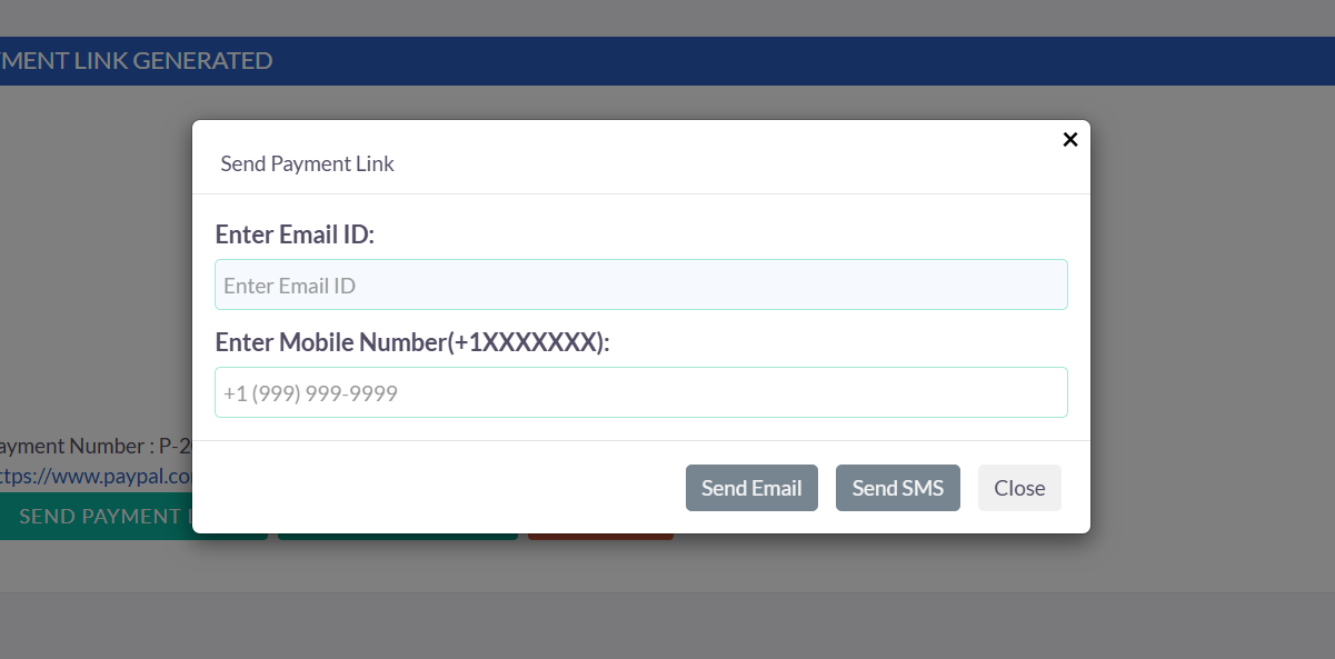 When you click on Send Payment Link, a popup will appear where you can send the payment link via email or phone.