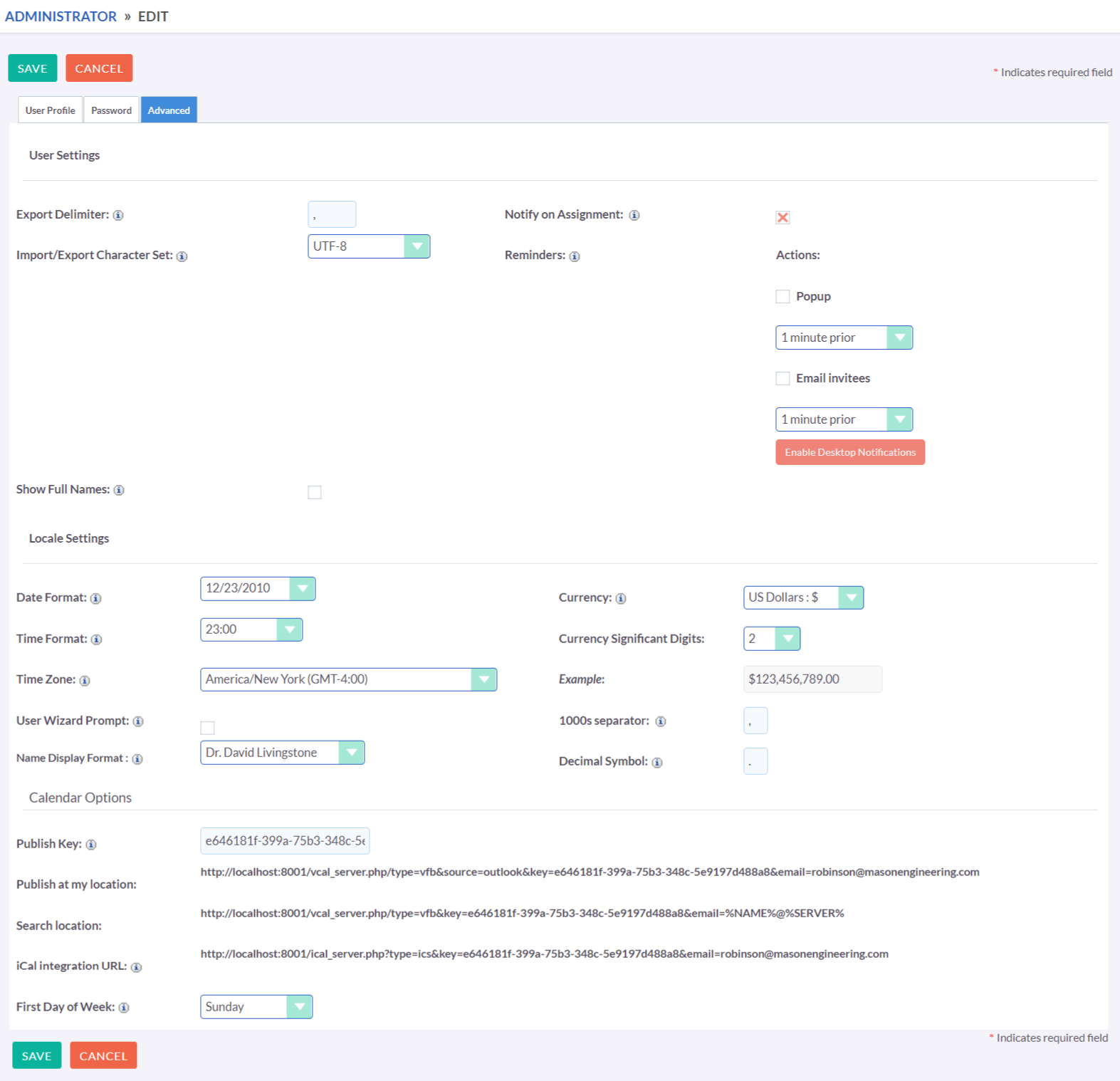 The Advanced tab offers you the capability to modify general preferences, such as notification settings, time zone, and display formats for date, time, and name.