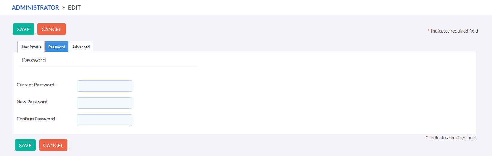 Clicking on the 'Password' tab will navigate you to allow you to change your user account password. To change your password, enter your current password then specify a new password and confirm the new password. It is recommended that passwords are secure. The recommended minimum requirement is one upper case character, one lower case character, one numerical character and a minimum password length of 8 characters.